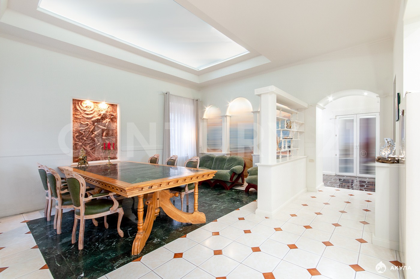 На первом этаже общей площадью 160 м² расположены: просторная гостиная 40 м², кухня 18 м², гостевая спальня 19 м² и санузел. В отделке использованы материалы ведущих итальянских производителей премиального класса. Кухня полностью оборудована бытовой техникой. Высота потолков 4 м. Паркинг площадью 50 м² переоборудован под кабинет и зону отдыха.