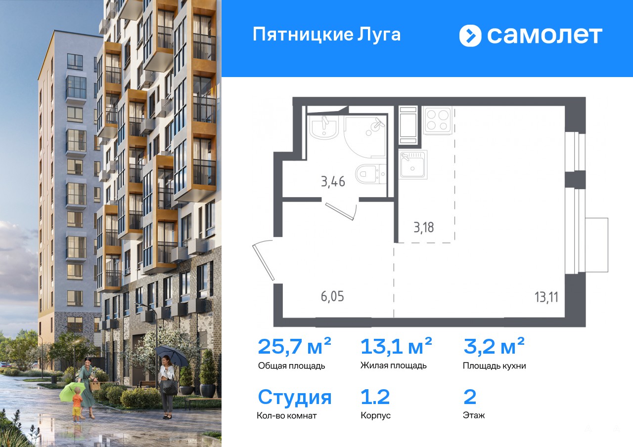 Предлагается квартира студия комфорт-класса 25, 7 кв.м в корпусе 1.2 на 2 этаже, в ЖК «Пятницкие Луга»