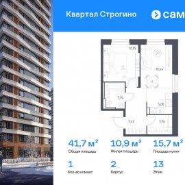 Строим кварталы для жизни с заботой о будущем. Предлагается 1-комнатная квартира комфорт-класса 41, 74 кв.м в корпусе 2 на 13 этаже, в ЖК «Квартал Строгино» Квартира без отделки. Доступность опции «отделка» и возможность комплектации мебелью и декором уточняйте у...