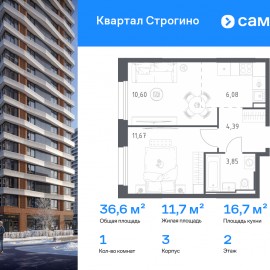 Строим кварталы для жизни с заботой о будущем. Предлагается 1-комнатная квартира комфорт-класса 36, 59 кв.м в корпусе 3 на 2 этаже, в ЖК «Квартал Строгино» Квартира без отделки. Доступность опции «отделка» и возможность комплектации мебелью и декором уточняйте у...