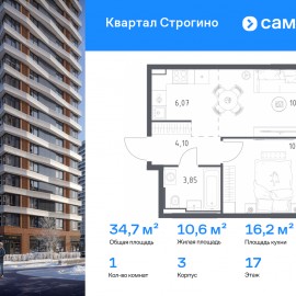 Строим кварталы для жизни с заботой о будущем. Предлагается 1-комнатная квартира комфорт-класса 34, 73 кв.м в корпусе 3 на 17 этаже, в ЖК «Квартал Строгино» Квартира без отделки. Доступность опции «отделка» и возможность комплектации мебелью и декором уточняйте у...