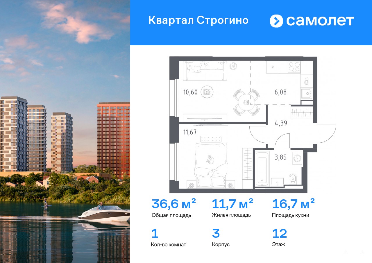 Строим кварталы для жизни с заботой о будущем. Предлагается 1-комнатная квартира комфорт-класса 36, 59 кв.м в корпусе 3 на 12 этаже, в ЖК «Квартал Строгино»