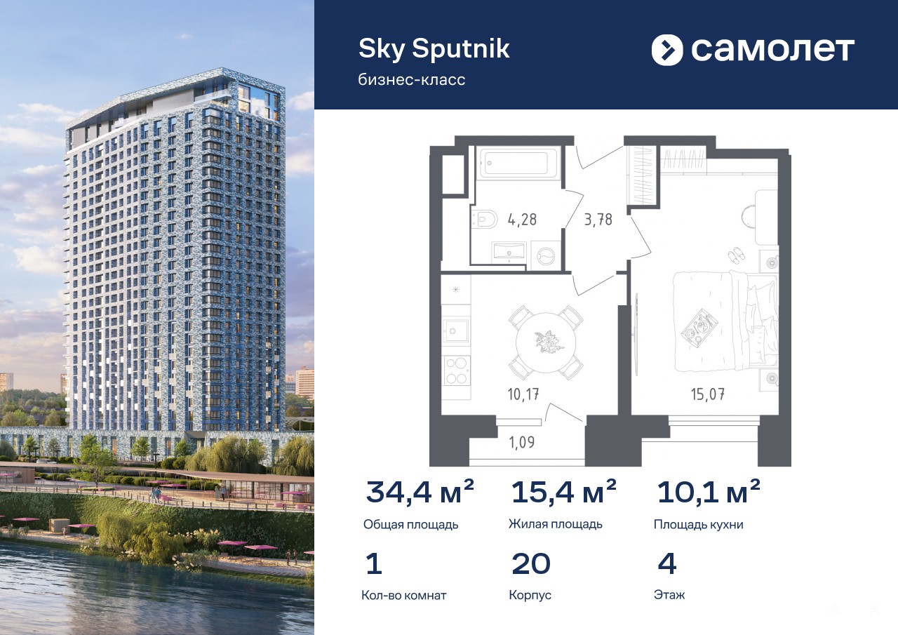 Строим кварталы для жизни с заботой о будущем. Предлагаются 1-комнатные апартаменты бизнес-класса 34, 39 кв.м в корпусе 20 на 4 этаже, в Sky Sputnik