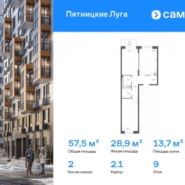 Строим кварталы для жизни с заботой о будущем. Предлагается 2-комнатная квартира комфорт-класса 57, 52 кв.м в корпусе 2.1 на 9 этаже, в ЖК «Пятницкие Луга» Квартира без отделки. Доступность опции «отделка» и возможность комплектации мебелью и декором уточняйте у...