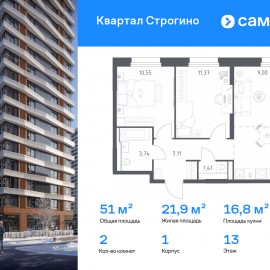 Строим кварталы для жизни с заботой о будущем. Предлагается 2-комнатная квартира комфорт-класса 51, 01 кв.м в корпусе 1 на 13 этаже, в ЖК «Квартал Строгино» Квартира с чистовой отделкой. Доступность дополнительных опций уточняйте у застройщика. Приобрести квартиру возможно по...
