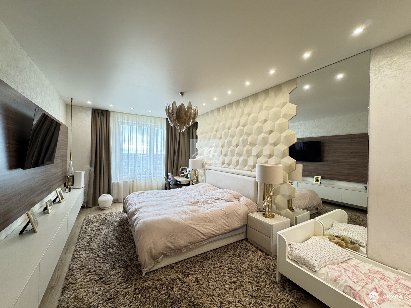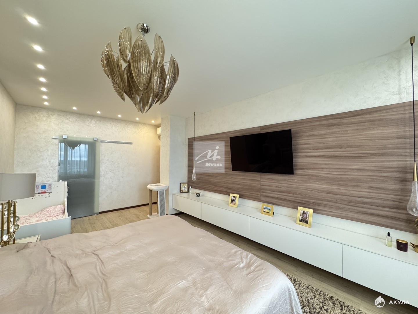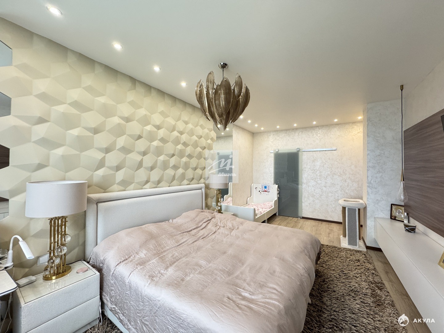 Отличное состояние и удобная планировка для семьи: большая гостиная с кухней, одна большая спальня с просторной гардеробной, один совмещенных санузел., что составляет 87, 4 кв.м. Пространство использовано органично, нет ничего лишнего, все функционально, что создает ощущение простора.