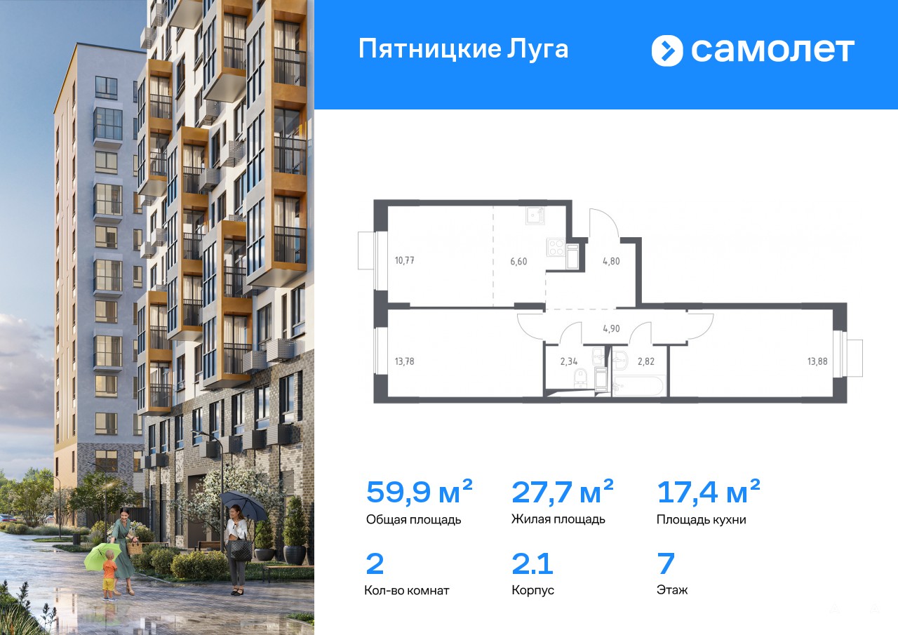 Строим кварталы для жизни с заботой о будущем. Предлагается 2-комнатная квартира комфорт-класса 59, 89 кв.м в корпусе 2.1 на 7 этаже, в ЖК «Пятницкие Луга»