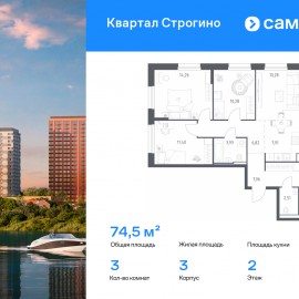 Строим кварталы для жизни с заботой о будущем. Предлагается 3-комнатная квартира комфорт-класса 74, 45 кв.м в корпусе 3 на 2 этаже, в ЖК «Квартал Строгино» Квартира без отделки. Доступность опции «отделка» и возможность комплектации мебелью и декором уточняйте у...