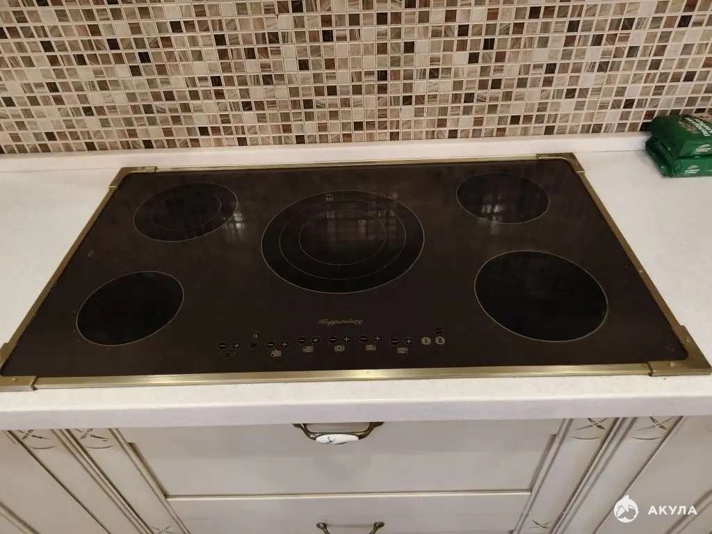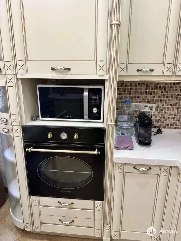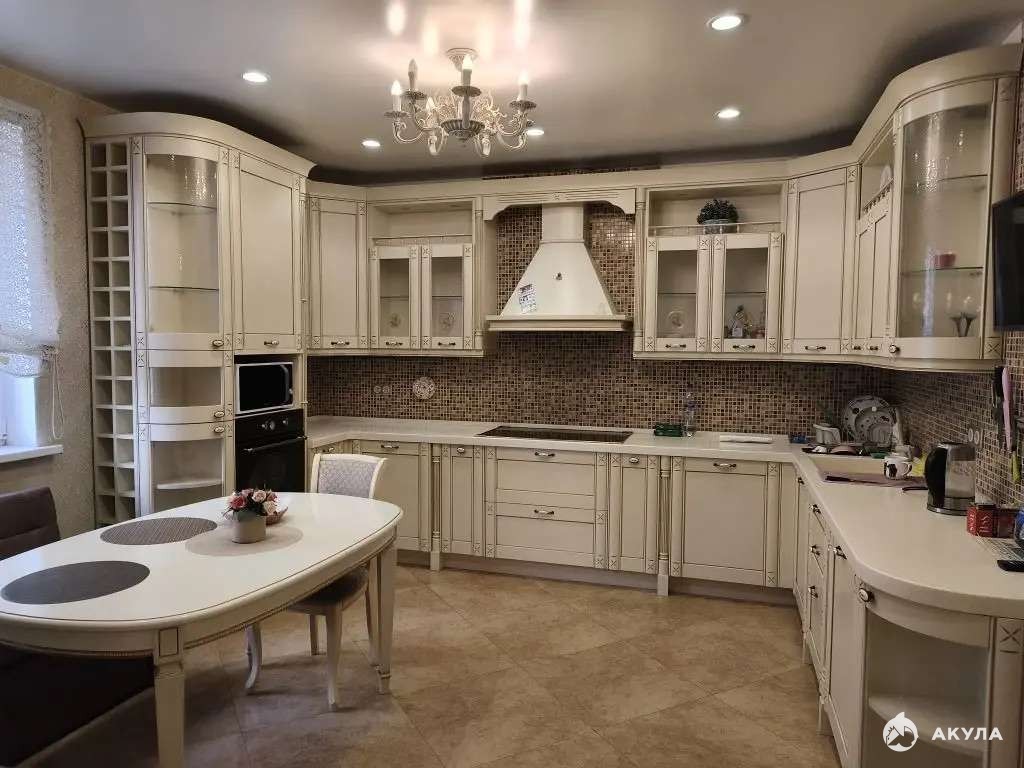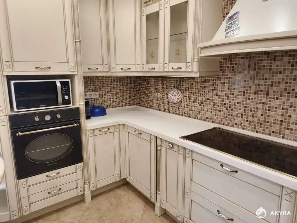 Просторная кухня: 21 м. Высота потолков: 2, 8 м. Эргономичный гарнитур со столешницей из искусственного камня и фартуком - мозаикой! Встроенная техника, 5-ти конфорочная варочная панель, 2-х створчатый встраиваемый холодильник Liebherr с отдельной морозильной камерой.