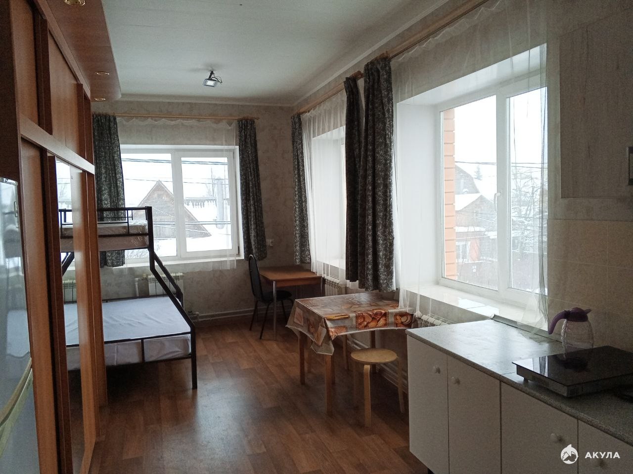 В Квартире-студии: метал/дверь, хороший ремонт, большой холодильник, 2-х ярусная кровать (низ 120*200см., верх 90*200см.), шкаф-купе, кухонный гарнитур, эл/плита, обеденный + рабочий столы; в С/Узле ванная + унитаз + стиральная машина + раковина; в студии всегда очень тепло (своя котельная), свои счётчики вода + электро.